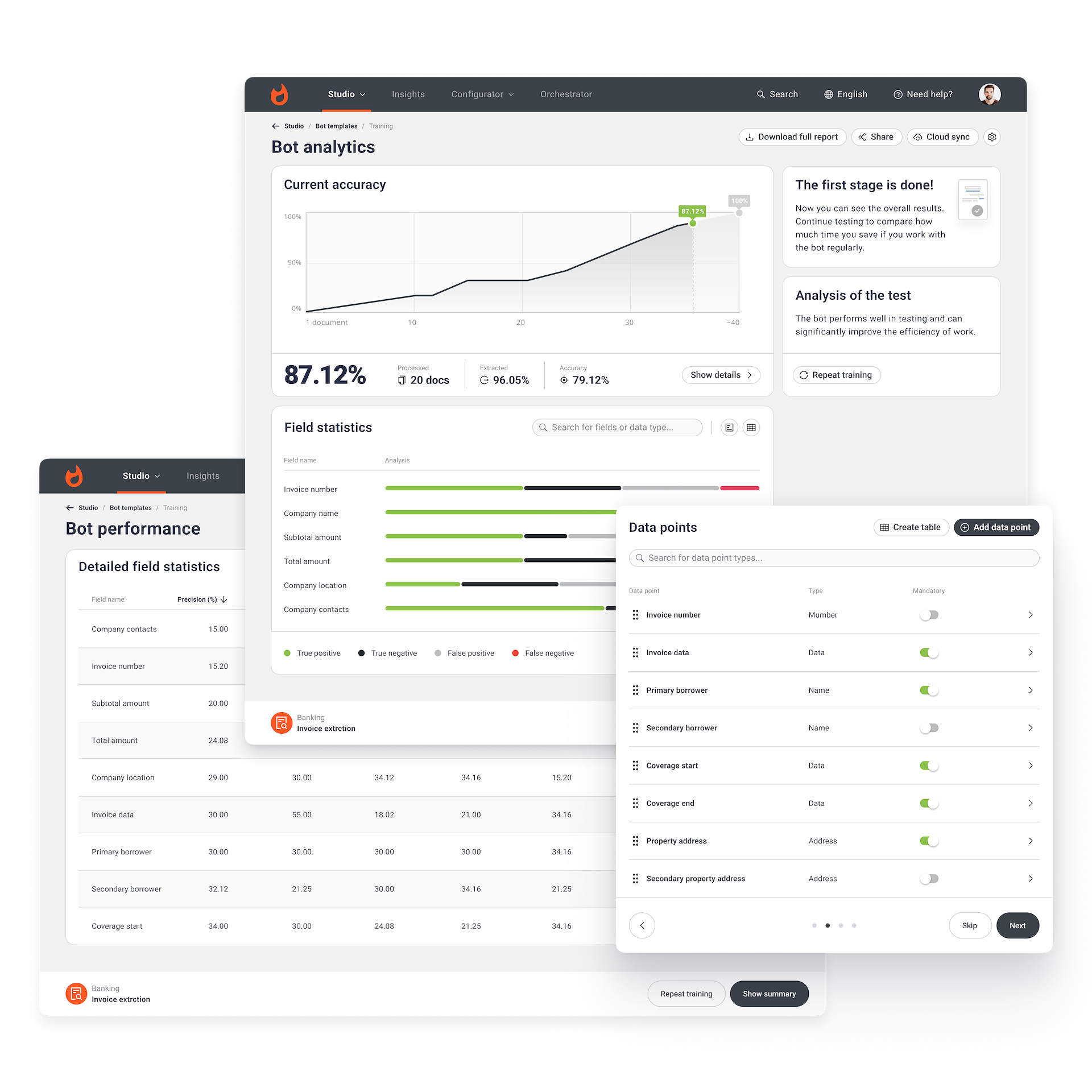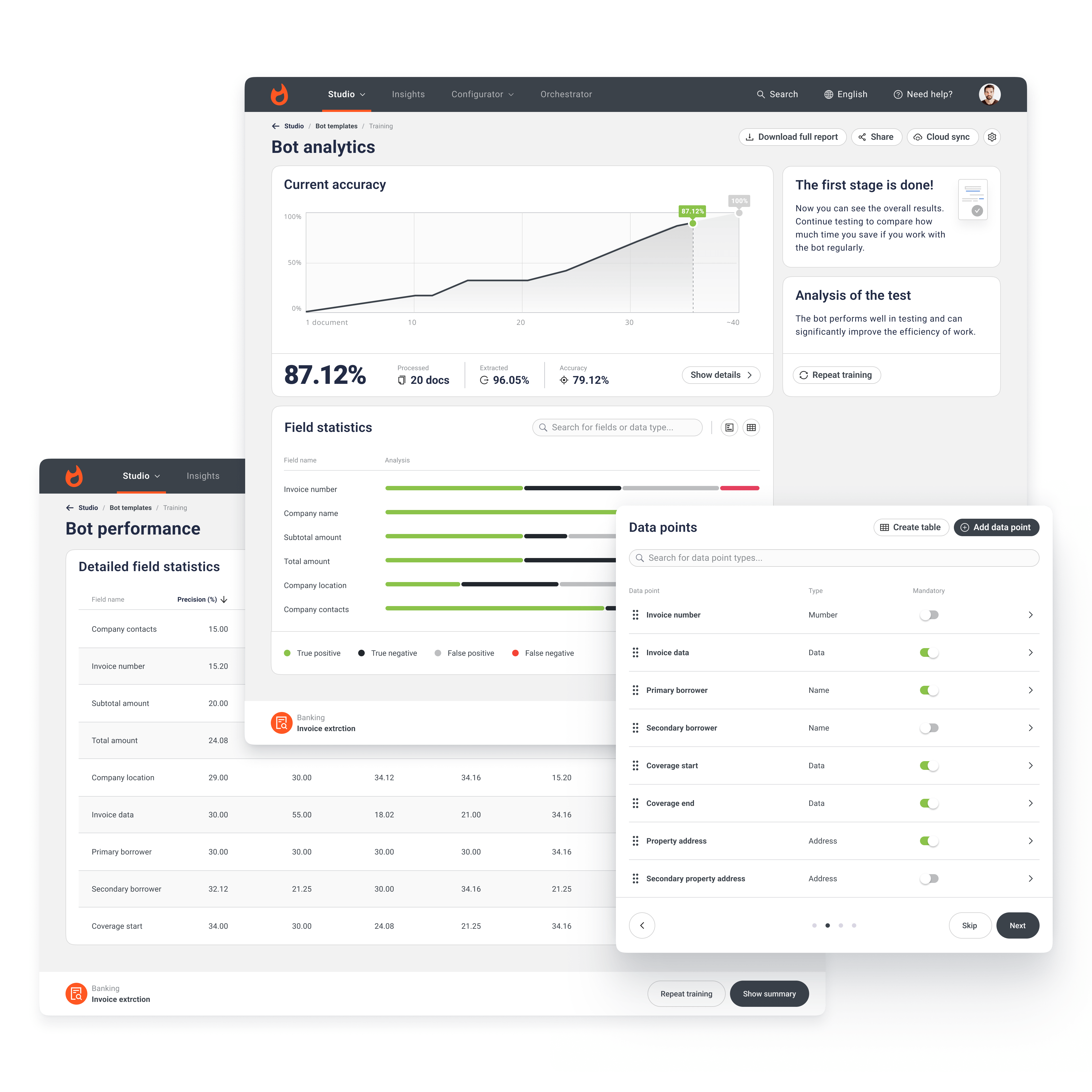 We delivered a solution that automates the most time-consuming tasks in targeted industries. The platform shows clear data visualizations so users can track bot training progress.