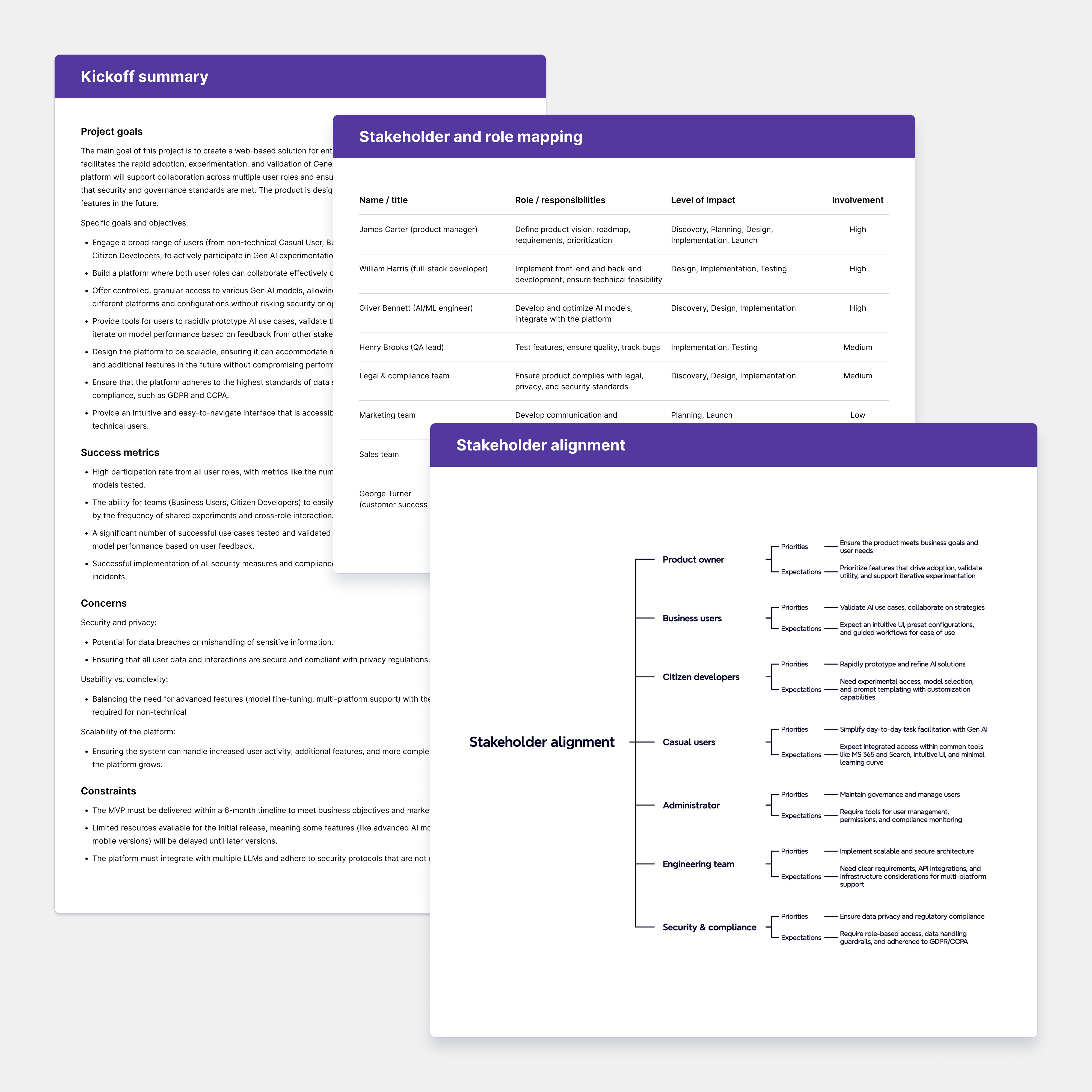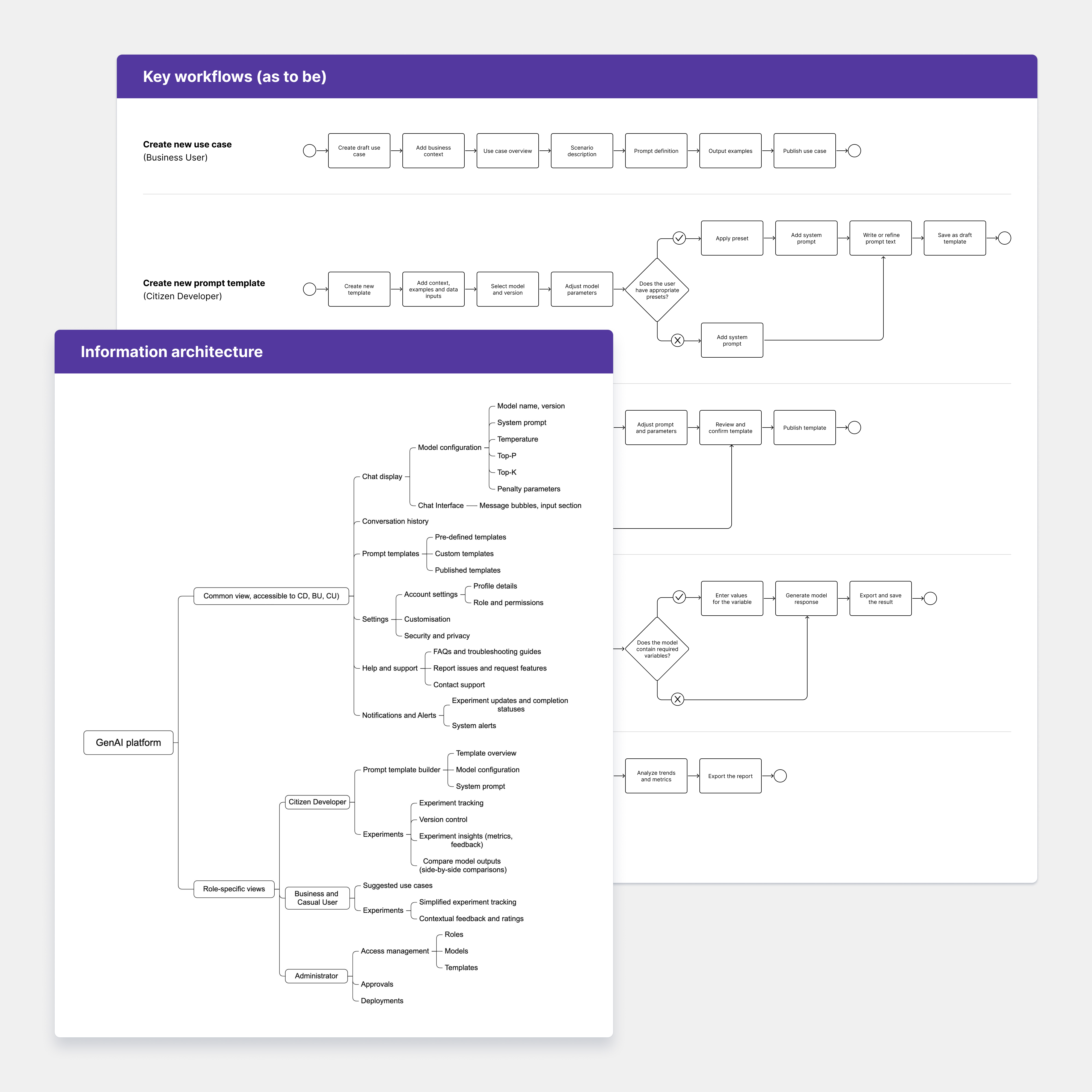 We began with a kickoff session to align on the vision, goals, and limits of the project. The main purpose of the platform was to help organizations adopt and test AI use cases through clear and collaborative workflows. Goals included better cross-role collaboration, reusable prompts, and simpler model comparisons for both technical and non-technical users. We also set early success measures, like cutting down the time needed to validate AI use cases and seeing higher adoption among business roles.