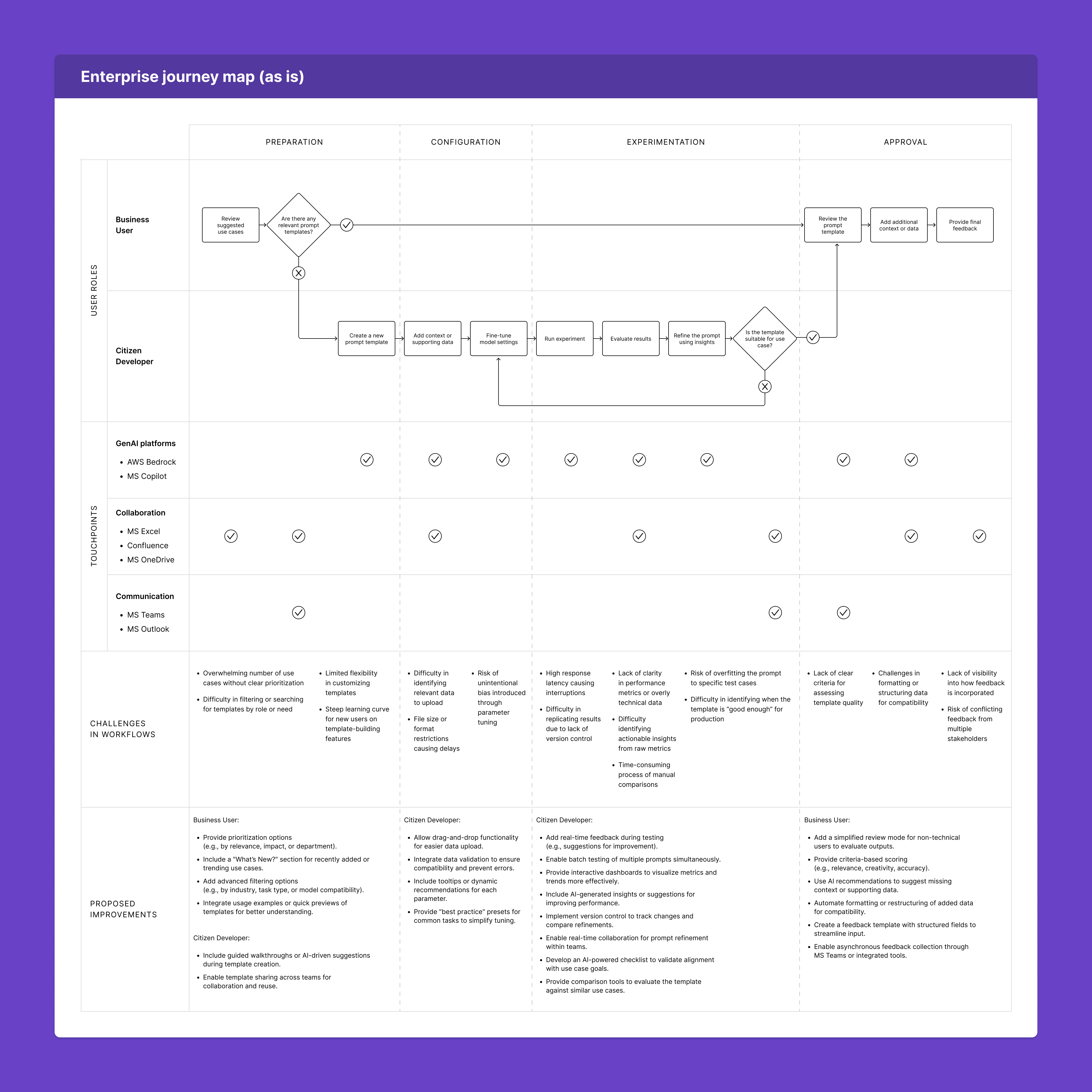 Alongside the user roles, I mapped the user journey to show how people currently worked together in their organizations. The map made it clear where business users and citizen developers faced friction. It also showed opportunities where the platform could make collaboration easier and workflows smoother.