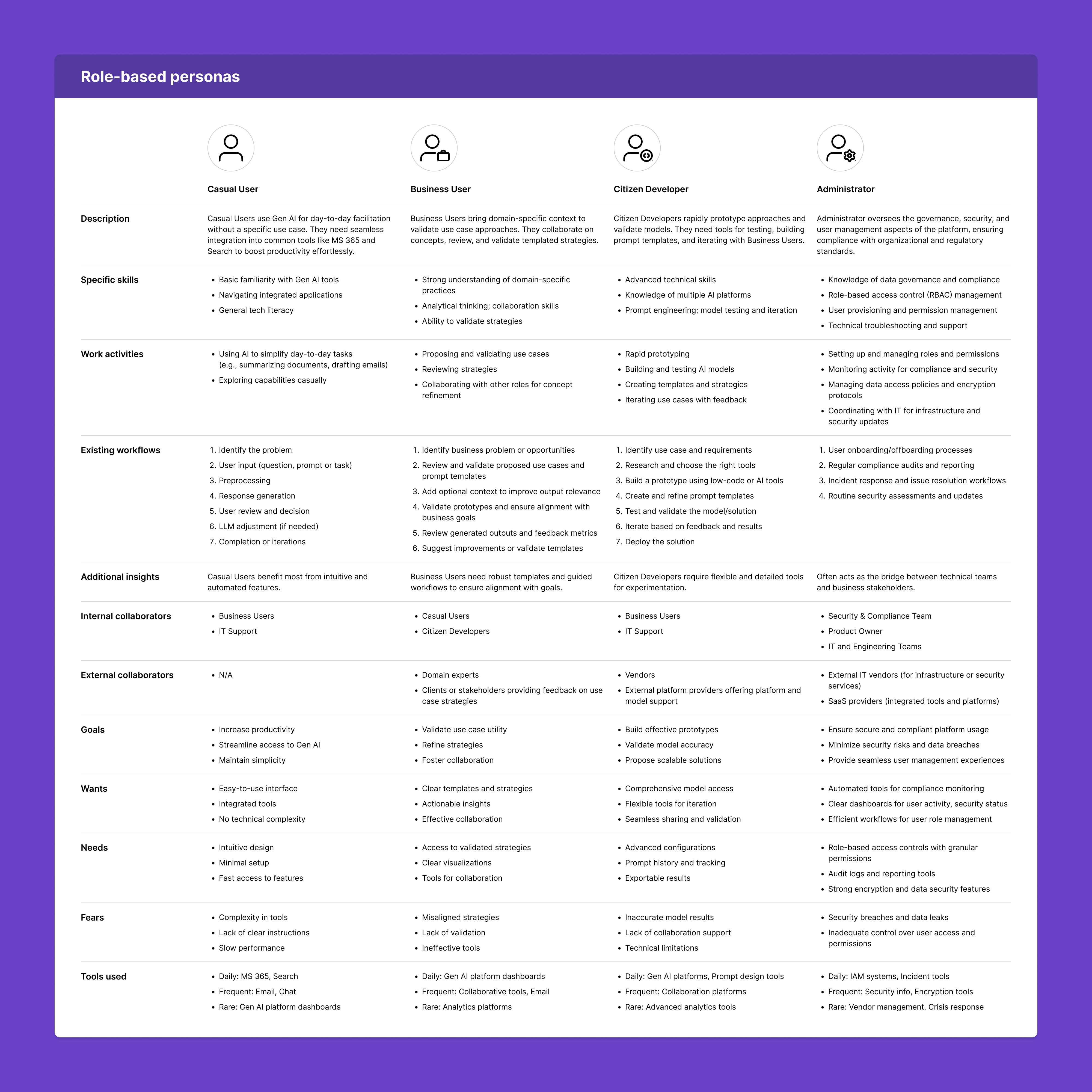 With research in place, I created role-based personas to capture who would use the platform and how. These covered both non-technical users and those with advanced AI knowledge. Each persona focused on tasks, workflows, tools, and collaboration habits, along with goals and concerns. This helped us design for a broader and more realistic set of needs.