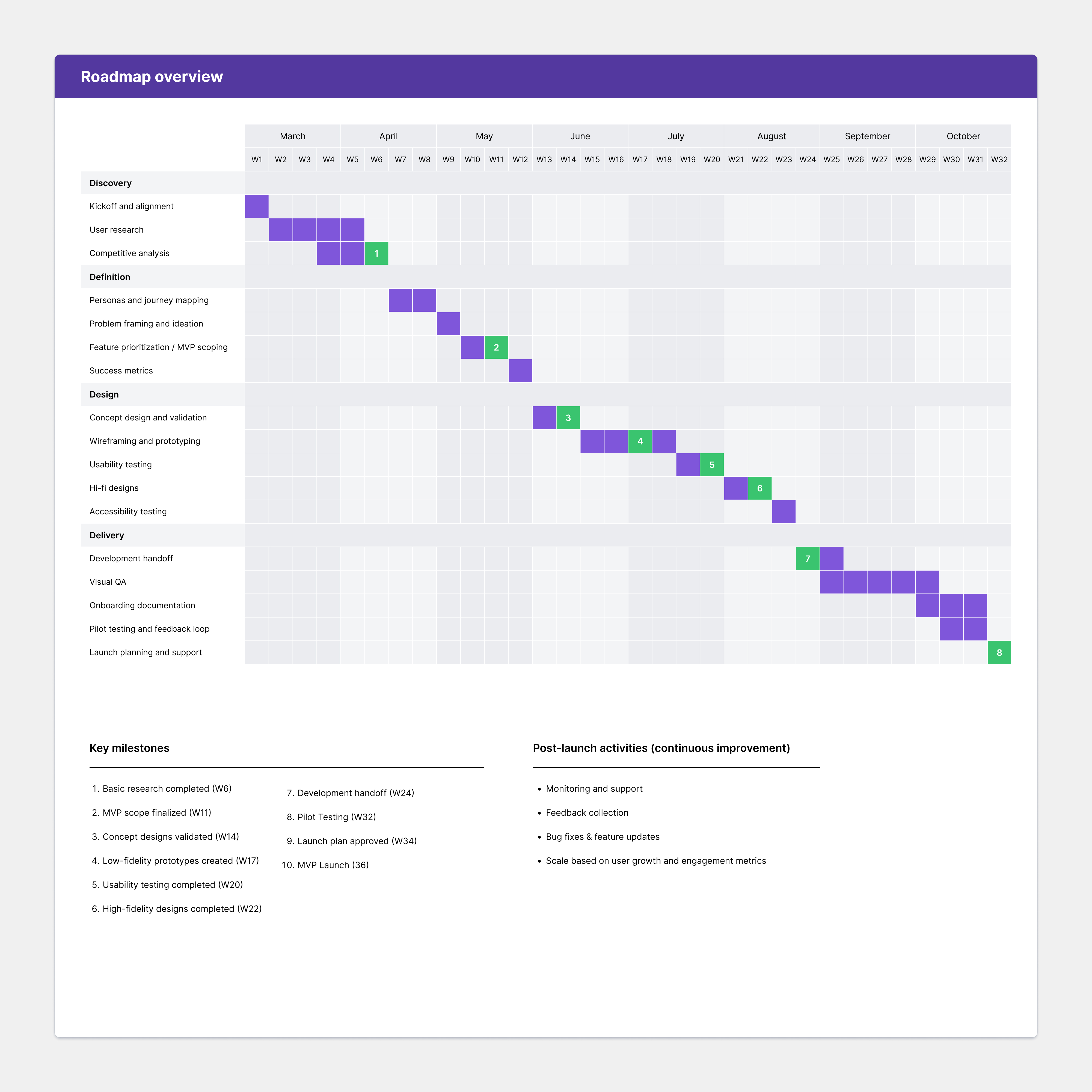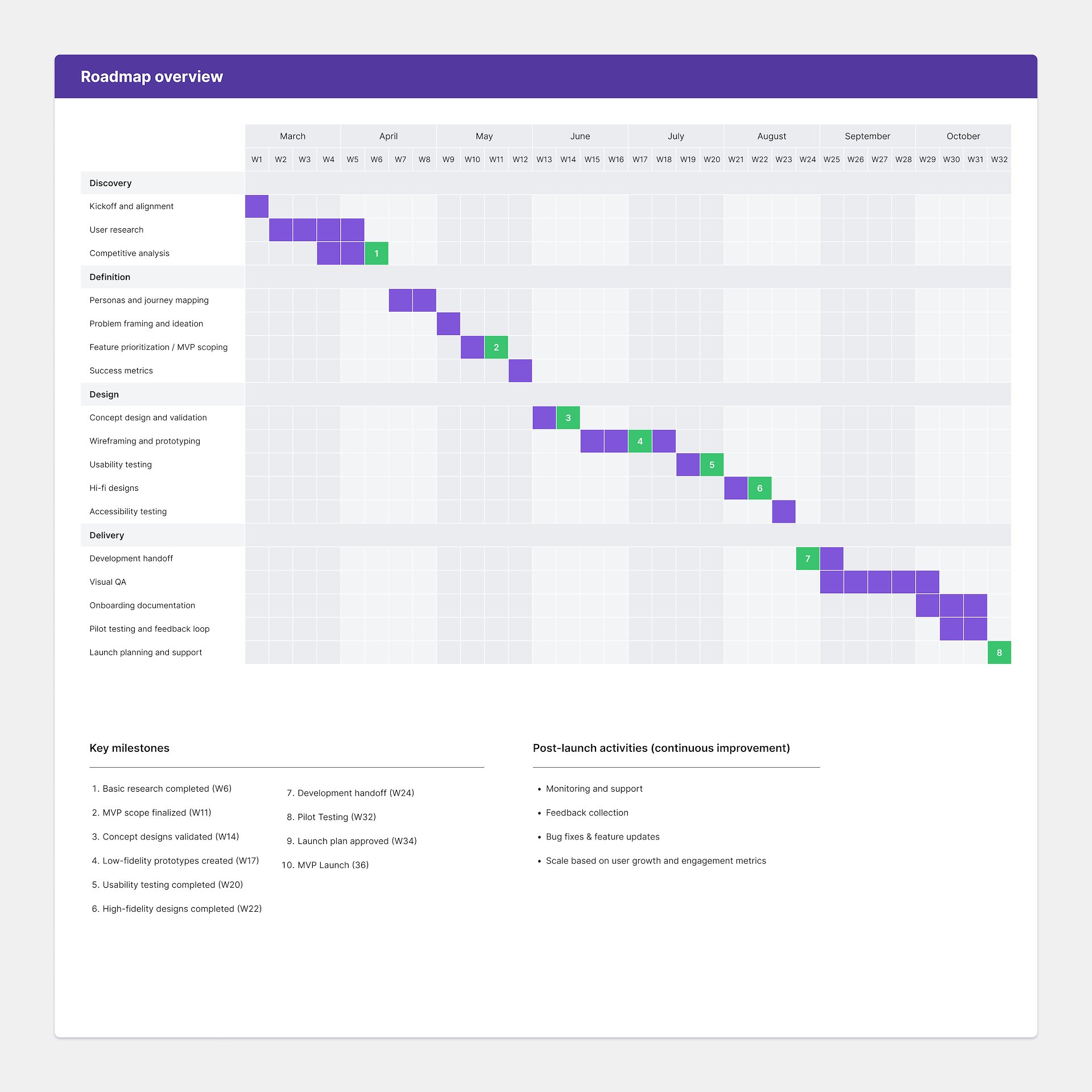 To guide research, I built a roadmap that showed methods, timelines, and how insights would shape design and development. It included competitor reviews, interviews, and user research, as well as milestones for sharing findings internally. Having this roadmap early helped set expectations and gave the work a steady rhythm.