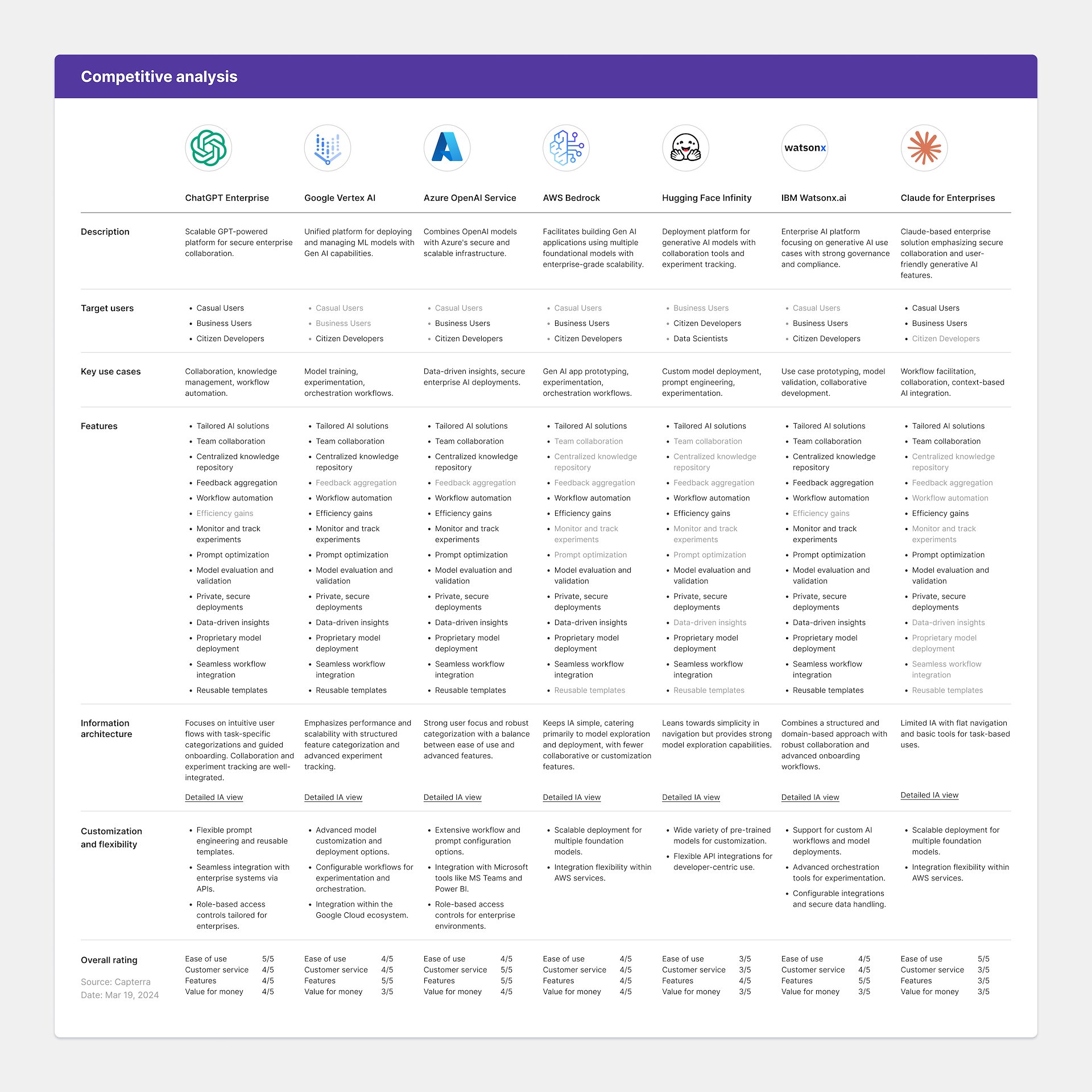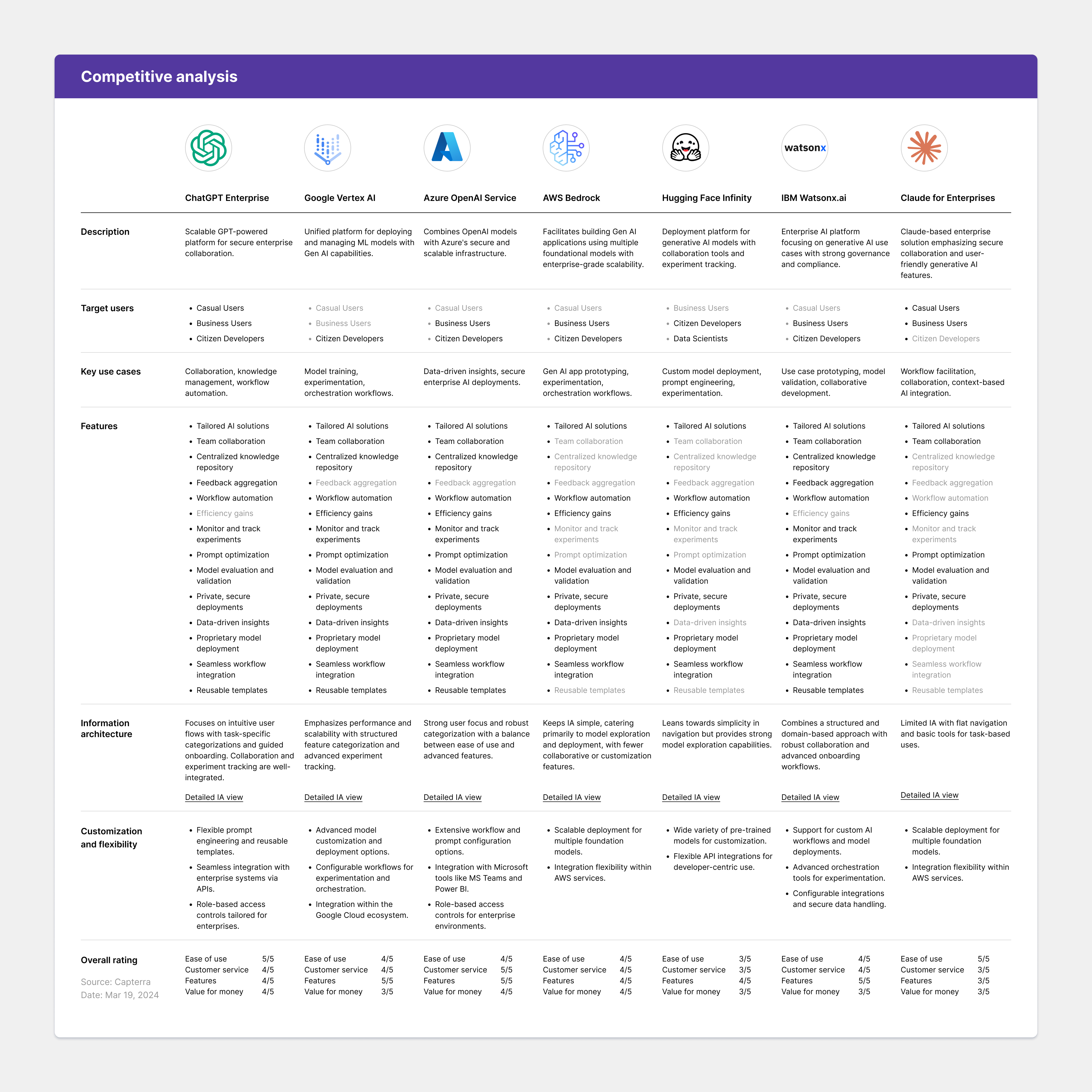 As part of this, I ran a comparative review of existing tools. The focus was on platforms offering features for prompt engineering, model testing, and AI collaboration. We looked at prompt management, multi-model support, onboarding for less technical users, and collaborative workflows.