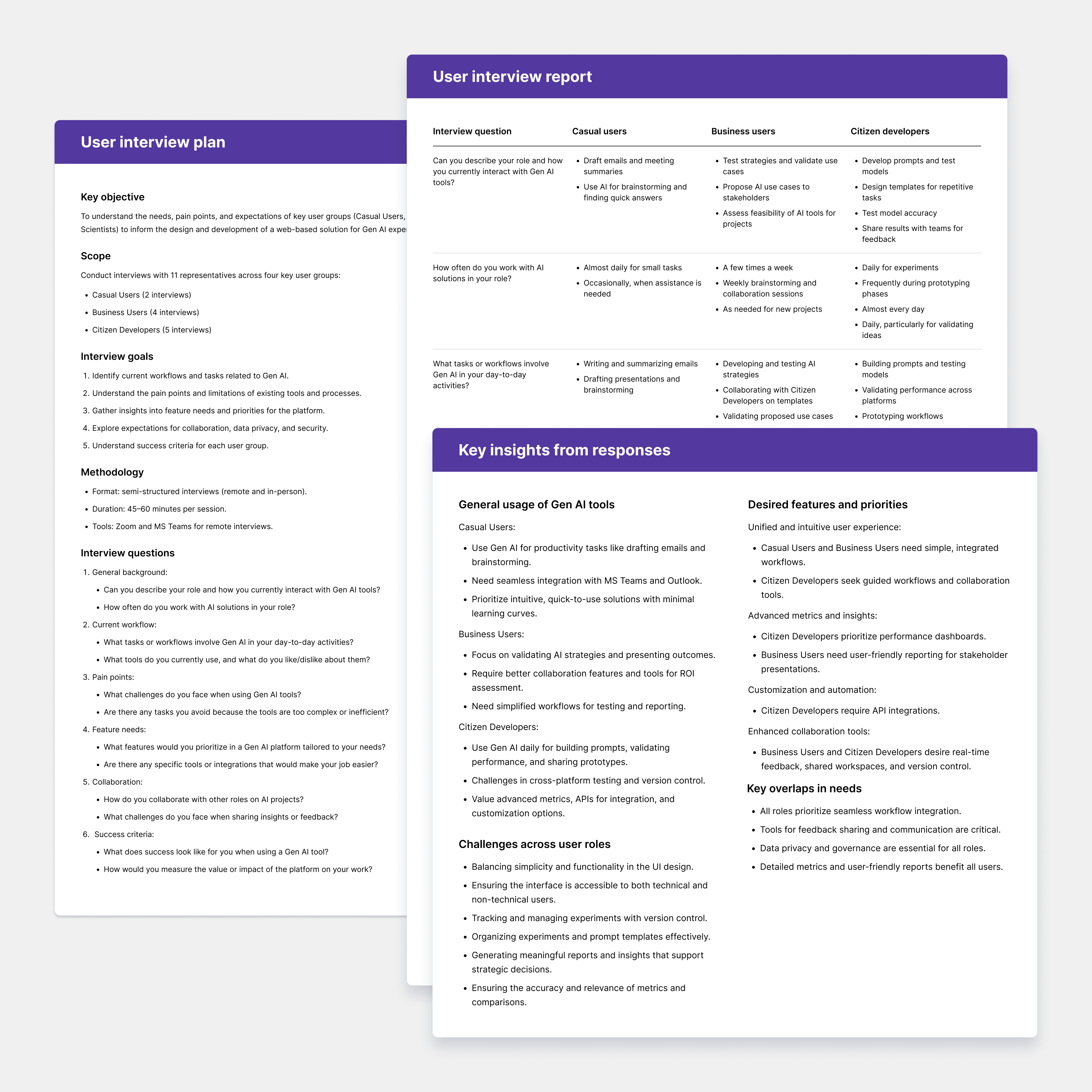 We then carried out interviews with three main user types: Casual Users, Business Users, and Citizen Developers. The sessions looked at how people currently used AI tools, their workflows, and where they faced challenges.