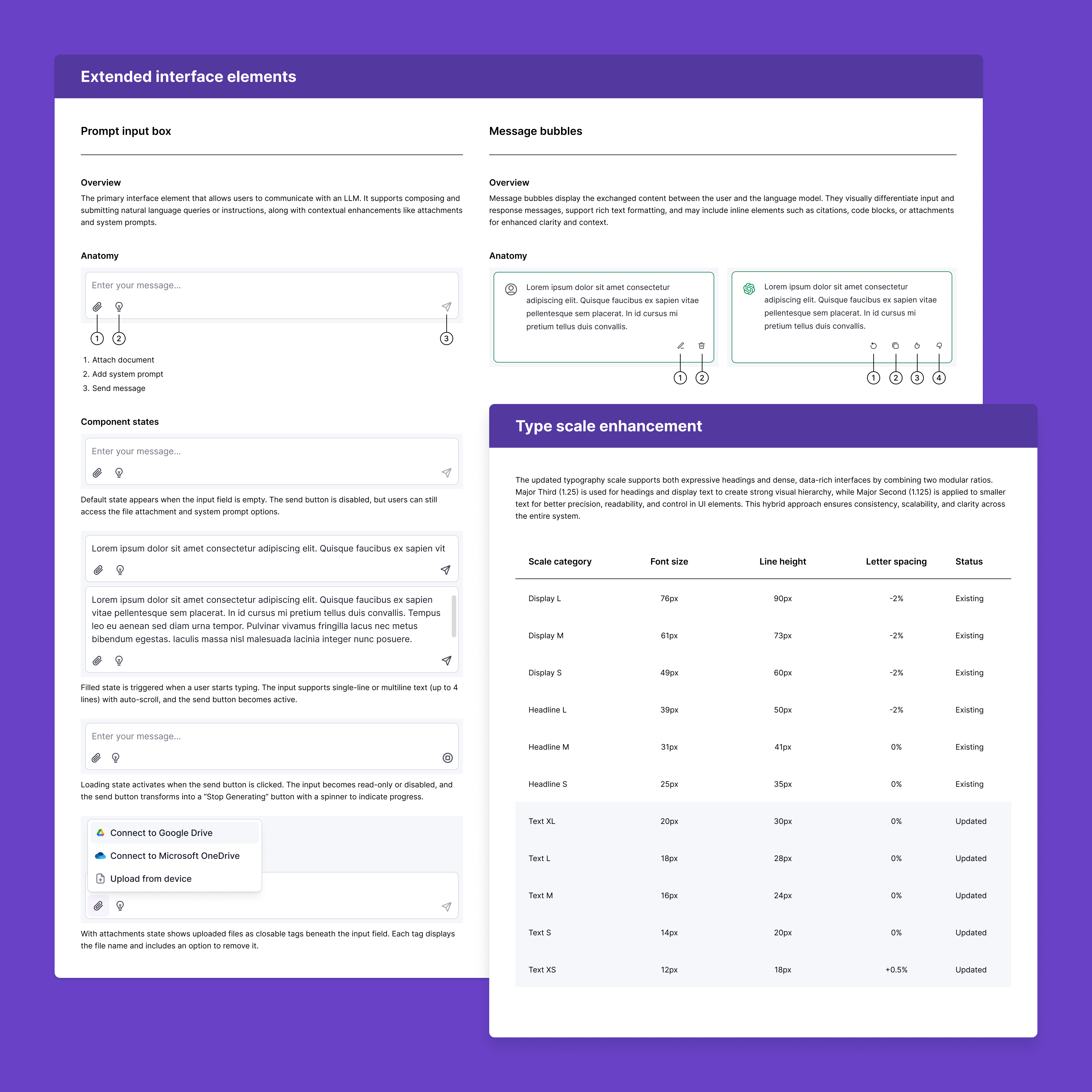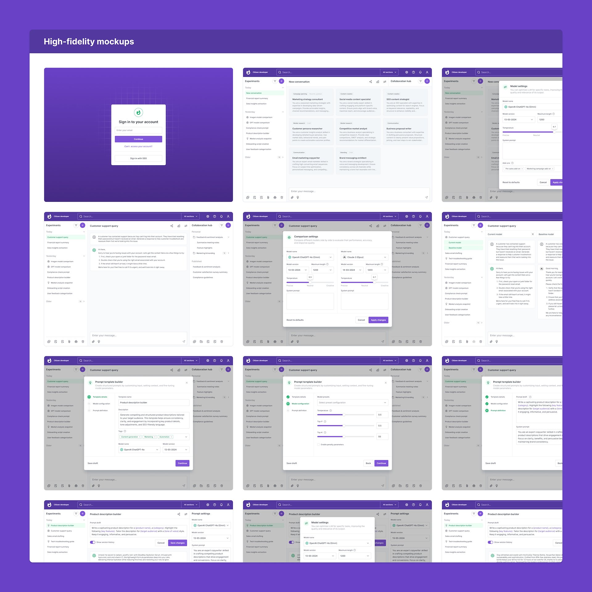 The design system was updated with new styles and components to support the platform. This included colors, type, spacing, and icons, as well as new components like template cards, model comparison screens, and step-by-step flows. Everything was documented with rules and examples to make reuse easier.