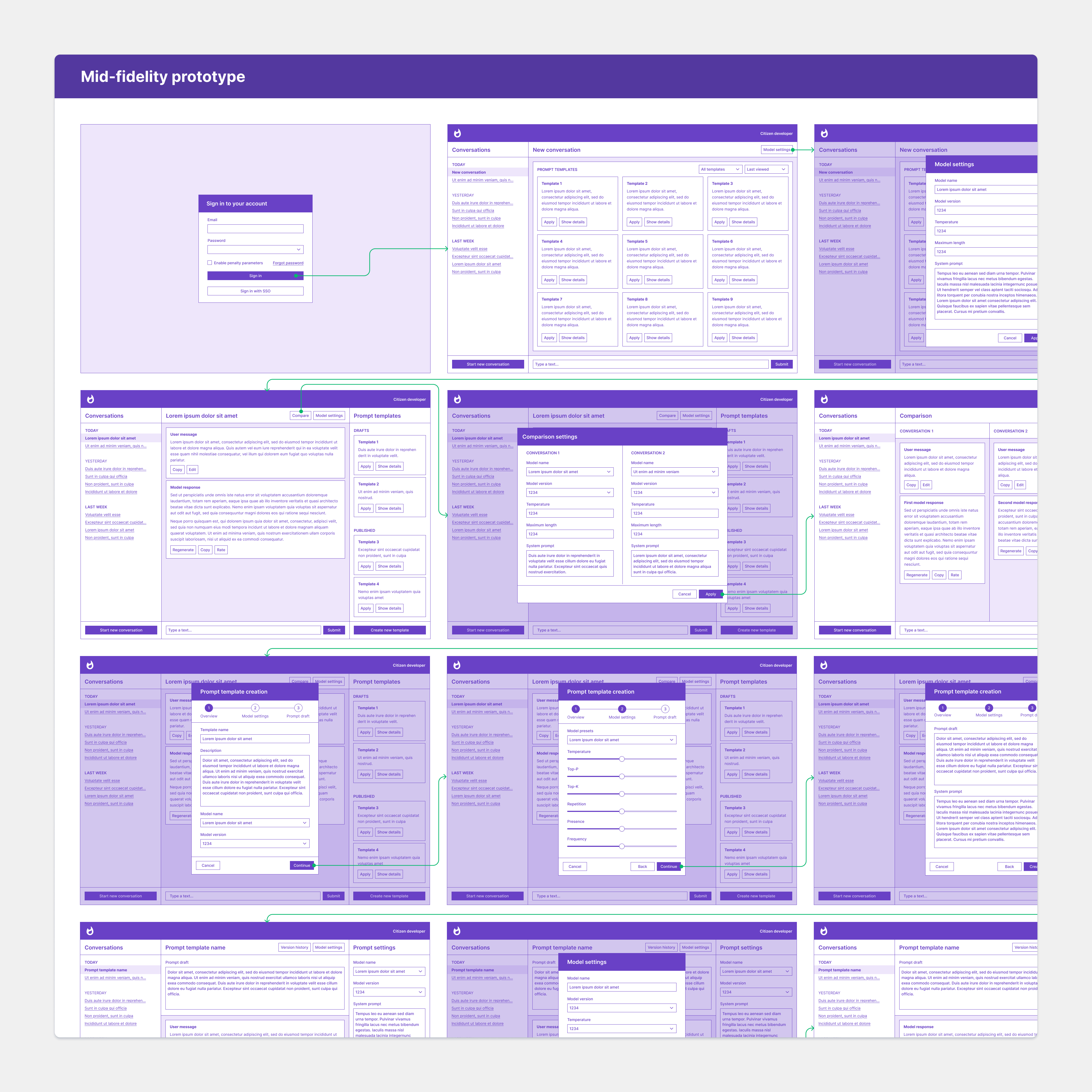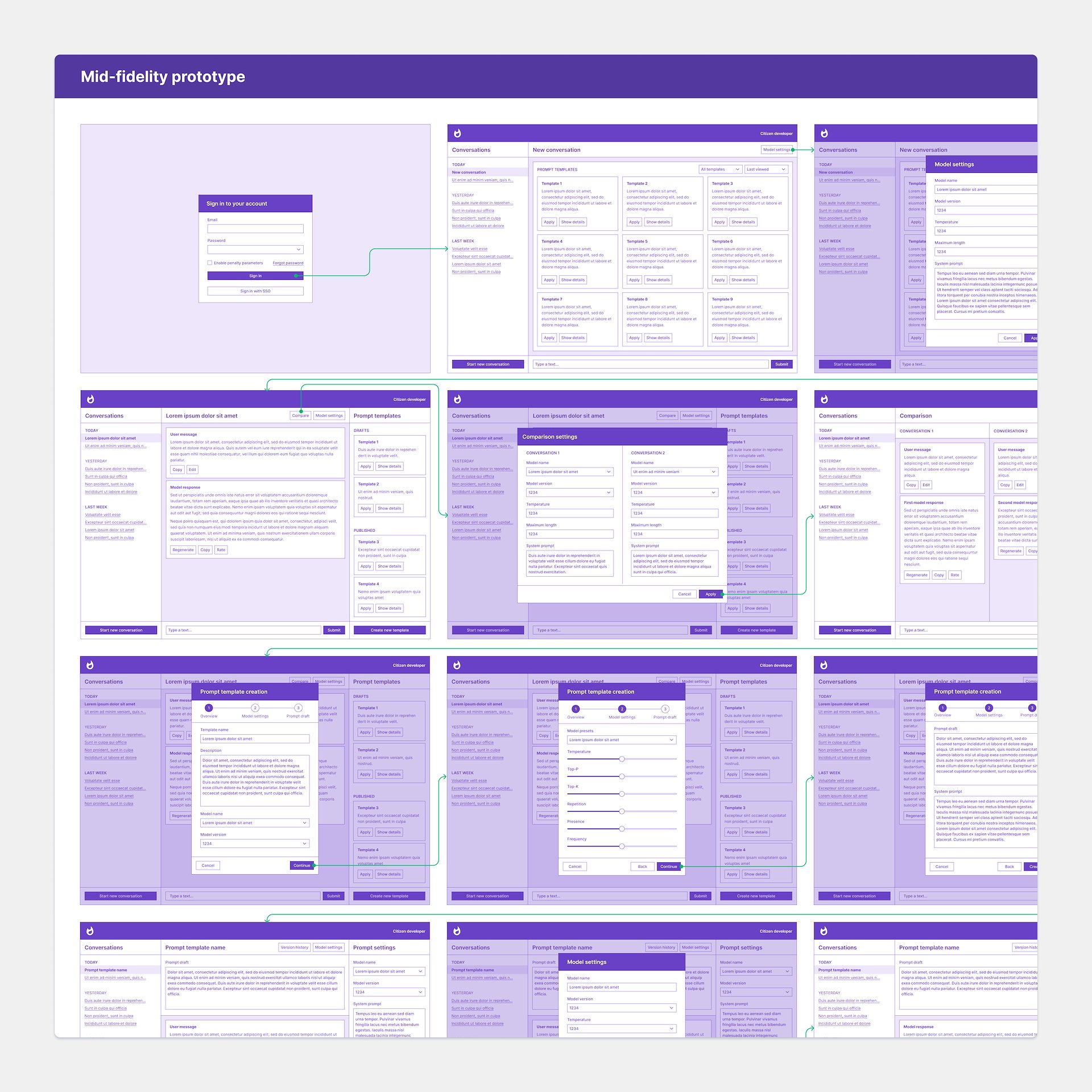 I then created a mid-fidelity prototype to test the structure and flows. It focused on navigation and interactions, not final visuals. The prototype included the core features we had defined earlier, such as reusable templates, model comparisons, and dashboards for each role. This helped visualize how different users would interact with the platform.